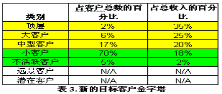 表3顯示客戶在分布上發(fā)生了重大變化,同時(shí)也給出了相應(yīng)的收入分布。目前,銷(xiāo)售總收入的80%來(lái)自活躍客戶(這部分客戶占總客戶數(shù)的60%)。在新的金字塔中,80%左右的銷(xiāo)售收入來(lái)自頂層客戶、大客戶和中型(黃色背影的)客戶。