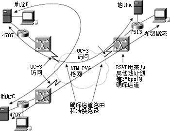 這個例子中,OC-3 ATM連接配置上3 Mbps PVCsL連到不同的遠程位置。RSVP確保QOS從這個PVC通過當?shù)氐木W(wǎng)絡路由連到正確的使用地。
