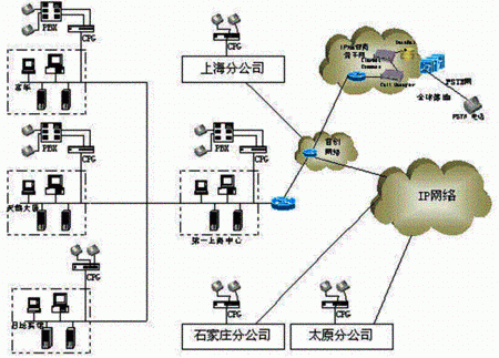 方案中VoIP的應(yīng)用是比較典型的,同時(shí)也有比較特殊的地方:溫州、石家莊等地區(qū)沒(méi)有被首創(chuàng)網(wǎng)絡(luò)覆蓋到,而客戶仍想采用IP電話方式,據(jù)此首創(chuàng)網(wǎng)絡(luò)提出了部分通過(guò)公網(wǎng)Internet傳輸數(shù)據(jù)的個(gè)性化方案以滿足客戶的需求。
