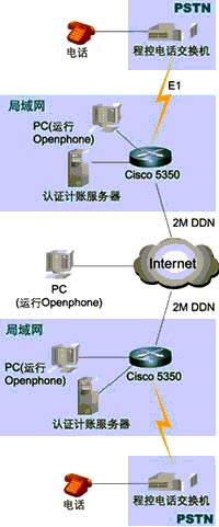 組成這個IP電話的網(wǎng)絡(luò)系統(tǒng)由處于兩個不同國家的區(qū)域組成(見附圖1網(wǎng)絡(luò)拓撲結(jié)構(gòu)),每個區(qū)域都采用了一臺Cisco 5350路由器(以下簡稱5350)作為網(wǎng)絡(luò)的核心,這臺5350路由器具有兩個WAN口和兩個以太網(wǎng)口,能夠直接連接到本地的局域網(wǎng)和DDN基帶調(diào)制解調(diào)器。和普通電話網(wǎng)絡(luò)(PSTN)相連接則是通過添加一個E1接口卡4PRI和一個IP語音數(shù)據(jù)處理單元NP60,來實現(xiàn)E1(30條ISDN的B信道)和路由器相連接,實時地對語音數(shù)據(jù)進行H.323壓縮編碼。