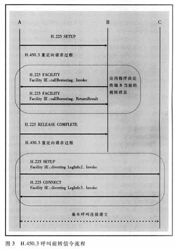 圖3顯示了可編程呼叫前轉(zhuǎn)的信令流程,在終端B的控制下通過把呼叫重新定向到一個(gè)新的目的地址而實(shí)現(xiàn)呼叫前轉(zhuǎn)。終端B在接收到SETUP消息后,發(fā)送一個(gè)包含前轉(zhuǎn)目的終端C地址的信令消息到呼叫發(fā)起終端A。然后終端A直接建立到終端C的連接,同時(shí)向終端C指明該業(yè)務(wù)的性質(zhì)和相應(yīng)信息。