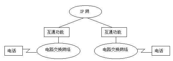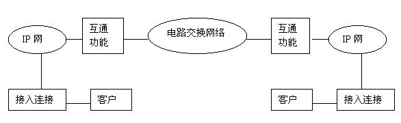 第三階段的重點是電路交換網(wǎng)通過IP網(wǎng)至電路交換網(wǎng),即實現(xiàn)以Internet作為傳送手段進行通信的目的,其示意圖如圖所示。