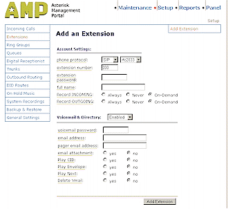 設置好中繼后,現(xiàn)在AAH就與你的VoIP服務提供商建立好連接了,接下來就是使用“Add an Extension”頁面(圖5)來設置你的電話了,每一個Extensions選項必需指定一個名字、數(shù)字和密碼,還可隨意給它指定一個語音信箱的目錄。