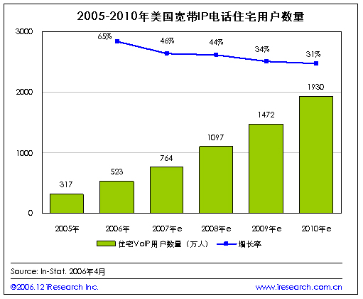 iResearch艾瑞市場(chǎng)咨詢根據(jù)In-Stat的調(diào)查數(shù)據(jù)整理發(fā)現(xiàn),2005年美國(guó)住宅VoIP用戶數(shù)量為317萬(wàn),到今年年底這一數(shù)字將達(dá)到523萬(wàn),比上年增長(zhǎng)65%.隨著寬帶互聯(lián)網(wǎng)接入的持續(xù)普及,據(jù)預(yù)測(cè)到2007年將有764萬(wàn)美國(guó)家庭使用寬帶接入的IP電話。