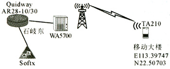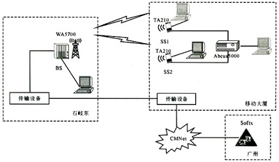 組網(wǎng)時,由于BS(石岐東)需要與廣州的SoftX連接,因此,實際組網(wǎng)方案通過傳輸設(shè)備連接公安局與移動大廈;然后通過移動大廈的CMNet網(wǎng)絡(luò)連接廣州的SoftX。在該個組網(wǎng)中,視距傳播環(huán)境通過固定在移動大樓支架上的遠(yuǎn)端站實現(xiàn),非視距傳播環(huán)境通過移動的遠(yuǎn)端站實現(xiàn)。