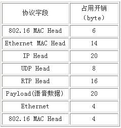 VoIP業(yè)務(wù)中語音數(shù)據(jù)是采用RTP協(xié)議進(jìn)行打包和傳輸?shù),流量大小與用戶之間采用的語音編碼方式有關(guān),本次測試采用的是VoIP業(yè)務(wù)最常用的語音編碼方式G.729,這種編碼方式對傳輸帶寬要求比較低,但語音質(zhì)量上足以滿足用戶的要求。按照協(xié)議,該編碼方式下的凈帶寬是8 K,其實際映射到WIMAX空口的整個過程是需經(jīng)很多次封裝。各種封裝協(xié)議所額外占用的開銷,如表1所示。