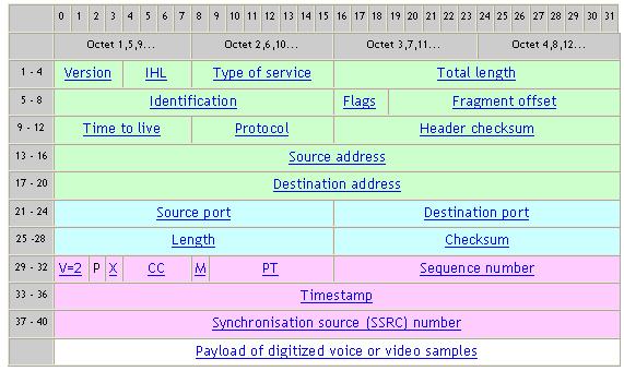 根據(jù)IETF的標(biāo)準(zhǔn)建議,通過IP網(wǎng)絡(luò)傳輸語音信號樣本需要增加三個額外的報頭,每個報頭對應(yīng)一個網(wǎng)絡(luò)層次,即IP,UDP和RTP [4]。
