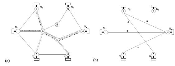 網(wǎng)絡(luò)拓?fù)淙鐖D3(a)所示,以鏈路A-C為例,將通過鏈路A-C的端到端的呼叫分別表示為a, b, c, d,如圖3(b)所示, (i =