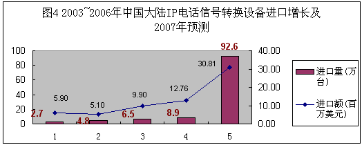 圖4:2003-2006年中國大陸IP電話信號轉換設備進口增長及2007年預測。