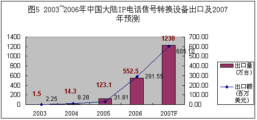 圖5:2003-2006年中國大陸IP電話信號轉換設備出口及2007年預測。