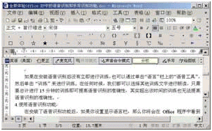 在安裝了語音識別功能后,如果你設(shè)置顯示語言欄,那么你將會(huì)在Office程序中看到如圖14所示的麥克風(fēng)圖標(biāo)(如果未看到,請從"工具"菜單中選中"語音"項(xiàng)),工作時(shí)將在"聽寫"和"聲音命令"模式之間進(jìn)行切換。