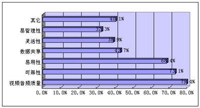 對(duì)于視頻會(huì)議系統(tǒng)需求特征,我們調(diào)查發(fā)現(xiàn),視頻音頻質(zhì)量、可靠性、易用性排在前三位,數(shù)據(jù)共享、靈活性、易管理性也得到應(yīng)有的關(guān)注和重視,如圖4所示。