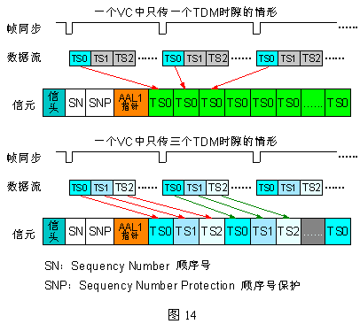 在同一個虛通道(VC)中,AAL1還支持一個或多個DS0(64Kbps)。當虛通道中只有一個DS0話音時,可以使用無結(jié)構(gòu)數(shù)據(jù)格式(UDF:Unstructured Data Format)傳送,這是一種面向比特的技術(shù);當有多個DS0同時傳送時,必須使用結(jié)構(gòu)化數(shù)據(jù)格式(SDF:Structured Data Format),此時各DS0數(shù)據(jù)流按字節(jié)依次傳送,即是面向字節(jié)的。這兩種格式的區(qū)別如下圖13所示。其中AAL1指針用于指示多DS0時,第一個DS0字節(jié)位置,以便定時。利用AAL1可以實現(xiàn)ATM對STM(TDM)信號的傳送,見圖14。