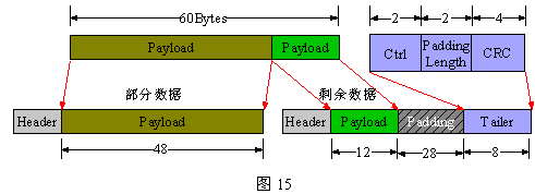 AAL5的信元格式,如下圖15所示。圖中給出了一個60字節(jié)的數(shù)據(jù)塊通過兩個ATM信元傳送的例子。