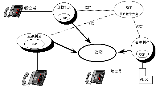 縮位撥號(hào)是指用一短的撥號(hào)(如三位)代替一長的撥號(hào)(如八位)的撥號(hào)方案。如下圖所示的智能網(wǎng)中,交換機(jī)A、B、C所有用戶的撥號(hào)方案數(shù)據(jù)都由SCP管理,當(dāng)交換機(jī)收到用戶的縮位撥號(hào)后,通過SS7鏈路訪問SCP數(shù)據(jù)庫,返回對應(yīng)的電話號(hào)碼,然后交換機(jī)通過公網(wǎng)把呼叫接通到該電話號(hào)碼,就和用戶直接撥打該電話號(hào)碼一樣。