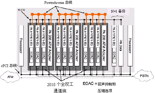 為了解決CompactPCI的這一限制,NMS開發(fā)出了PowerAccess體系結(jié)構(gòu),它借助現(xiàn)有的CompactPCI標(biāo)準(zhǔn),同時(shí)把它的通道容量擴(kuò)展到2048之上。這種體系結(jié)構(gòu)以PowerAccess總線為特色,PowerAccess總線是一個輔助的4096個TDM時(shí)隙,支持現(xiàn)存的CompactPCI H.110總線。由于提供語音通道的增多,從而可以提高系統(tǒng)的密度。