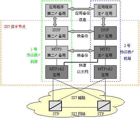只有SS7鏈路出現(xiàn)故障時,SS7協(xié)議才有相應的規(guī)則去處理故障,對其它故障的處理必須在設計SS7平臺和整個系統(tǒng)結(jié)構(gòu)時予以考慮。還有一個普遍的要求是:軟件的升級過程中不能影響整個系統(tǒng)的運行。能達到以上要求的一個解決方案是:使用兩個主機箱,在每個主機箱里插有SS7接口板,用于支持一條或多條SS7鏈路。讓兩個主機都使用一個SS7地址,也就是共用一個信令點編碼,這樣遠端的交換機或STP就會認為這兩個主機是一個完整的系統(tǒng)。這樣,這兩個主機組成的系統(tǒng)就能在其中一個出現(xiàn)故障時仍能正常工作。