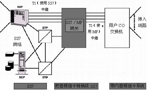 如圖14所示,SS7/MF網(wǎng)關(guān)可以實(shí)現(xiàn)SS7信令到MF(多頻)信令的轉(zhuǎn)換,使現(xiàn)有MF信令交換機(jī)無須升級就能擁有SS7信令能力;旌狭薙S7和基于音頻信令的呼叫建立環(huán)境能為各種運(yùn)營商經(jīng)濟(jì)實(shí)用的SS7網(wǎng)絡(luò)接入方案,采用這一方案的有蜂窩電話運(yùn)營商、本地電話運(yùn)營商、長途電話運(yùn)營商和其它一些仍使用舊式交換機(jī)的電話運(yùn)營商。