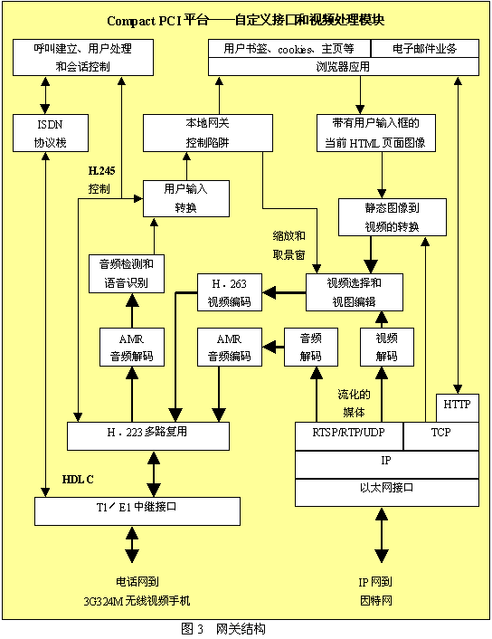 圖3所示為網(wǎng)關(guān)重要組成的分解圖。網(wǎng)關(guān)機(jī)箱很可能是一個(gè)Compact PCI機(jī)箱,機(jī)箱中包含了作為網(wǎng)絡(luò)中一個(gè)節(jié)點(diǎn)的所有組件。基本的視頻呼叫和瀏覽器應(yīng)用可以運(yùn)行在主處理器上,但T1或E1接口需要由附加模塊來(lái)支持。為了支持大量的端口,還需要附加的以太網(wǎng)接口和自定義的視頻處理模塊。T1/E1接口通過公共電話網(wǎng)接入無(wú)線交換中心,也可以直接接入到無(wú)線交換中心。以太網(wǎng)接口會(huì)通過標(biāo)準(zhǔn)IP路由器接入到因特網(wǎng)。