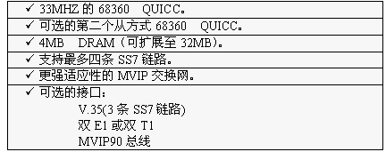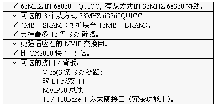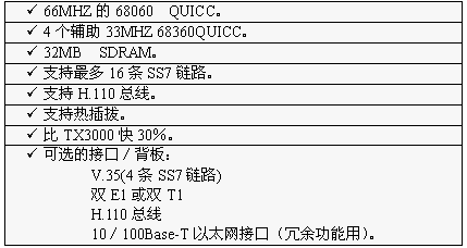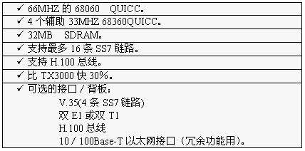 TX3000卡的功能大致和TX2000卡相同,但它比TX2000的性能2.5至5倍。TX3000卡上有一個66MHZ的68060協(xié)處理器。TX3000卡為SS7應(yīng)用配置1至4個QUICC通信控制器,最多16條信令鏈路,提供一個三口V.35,擁有雙T1或雙E1接口。(主板上標準配置一個QUICC,支持四條SS7鏈路,當CT總線和串行接口都要使用,或者處理的鏈路超過4條時,可先配置有三個QUICC的背板,四個QUICC可支持16條SS7鏈路)。