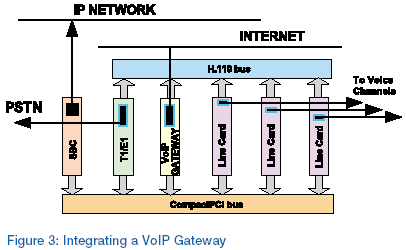 其它新業(yè)務(wù),例如IP話音(VoIP),如果要達(dá)到理想的性能,就需要電信系統(tǒng)內(nèi)部的集成,增加一塊網(wǎng)關(guān)板卡,作為附屬在CompactPCI總線和H.110總線上的外圍設(shè)備。現(xiàn)在,有了額外硬件(網(wǎng)關(guān)板卡)和VoIP的額外軟件,充分利用VoIP性能就成為可能(圖3)。