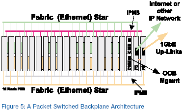 圖6的設(shè)置表明,在一個(gè)集成的分組交換底板解決方案中,這種最開始基于幾種不同機(jī)箱而開發(fā)的解決方案可能看起來象什么。建立在CompactPCI
