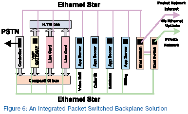 PICMG 2.16兼容平臺(tái)上,這種解決方案充分利用了有背板結(jié)構(gòu)的以太網(wǎng)交換的集成特性,以提供任意插槽(節(jié)點(diǎn))和以太網(wǎng)交換插槽兩者之間的物理連接。有著特定的串行卡,可能是語(yǔ)音處理卡,SDSL集中器,或一塊VoIP網(wǎng)關(guān)卡,通過使用在這些卡上的CompactPCI控制平面和H.110數(shù)據(jù)平面得以實(shí)現(xiàn)。(為了清晰,額外的不被使用的CompactPCI總線部分,和相關(guān)的H.110總線部分,在圖6中忽略)