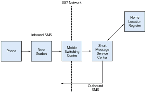 從MSC, SMS消息在SS7網(wǎng)絡(luò)中發(fā)送到短消息中心(SMSC), 一個網(wǎng)絡(luò)的標準部分. SMSC向Home Location