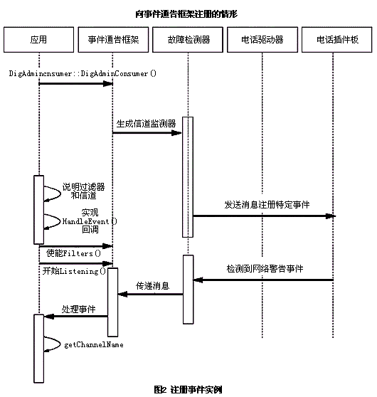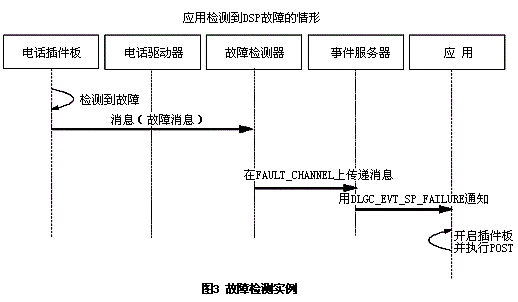 。。在這個(gè)事務(wù)中的主要部件是應(yīng)用程序、板卡的設(shè)備驅(qū)動(dòng)器和管理軟件(包括故障檢測(cè)器和事件服務(wù),事件服務(wù)中同時(shí)包括事件通告框架)。當(dāng)電話板卡發(fā)生DSP故障時(shí),板卡上運(yùn)行的固件通過發(fā)送一條消息通知控制程序?刂瞥绦蚴且粋(gè)在初始化時(shí)注冊(cè)了不同告警和故障的故障檢測(cè)器。當(dāng)它收到這個(gè)故障通告后,控制器在事件服務(wù)的事件通告框架的隊(duì)列中增加一個(gè)事件。最后,使用回調(diào)函數(shù)通知應(yīng)用程序。此時(shí),應(yīng)用程序可以處理這個(gè)事件,執(zhí)行必要的操作或者動(dòng)作。