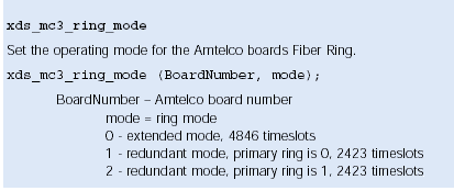 使用xds_mc3_connect、xds_mc3_listen、and xds_h100_listen函數(shù)分配由Amtelco卡使用的時隙,xds_mc3_connect在光纖環(huán)路和CT總線之間創(chuàng)建一個全雙工連接,所有的參數(shù)都可以在Amtelco板上得到。CT總線傳輸?shù)膮?shù)是Amtelco卡將要傳給CT總線CT的。