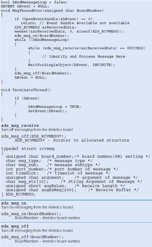 缺省情況下Amtelco卡不向應(yīng)用發(fā)送消息,應(yīng)用必須調(diào)用sdx_msg_on函數(shù)請求消息發(fā)送。當(dāng)用應(yīng)用停止后,需要sdx_msg_off函數(shù)停止發(fā)送消息。(注意:如果運行多個應(yīng)用監(jiān)控板上消息,確信必須是最后一個應(yīng)用調(diào)用sdx_msg_off函數(shù))