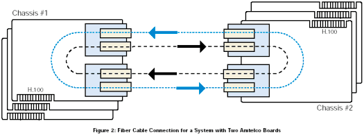 為了能夠共享時隙,將本地服務(wù)器上的CT總線連接到Amtelco光纖環(huán)路,然后從光纖環(huán)路連接到另外一個服務(wù)器的本地CT總線。圖11是一個簡單圖示,顯示了一個服務(wù)器1上的中間設(shè)備(dxxxBxCx)到另外一個服務(wù)器2上的中間設(shè)備(dxxxBxCx)的連接。